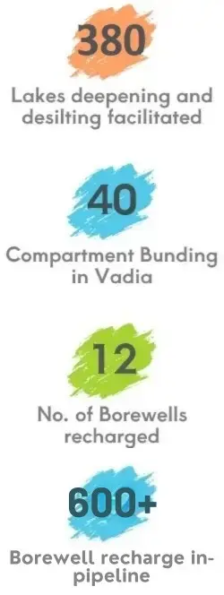 In the year 2015 VSSM initiated Participatory Water Management campaign from the village of Vadia and went on to extend it in some severely water challenged villages of Banaskantha district. The initiative aims to increase water sufficiency by desilting and deepening the village lakes in Banaskantha. Once the lakes are able to capture and hold more rain water, the ground water tables will improve over time. Just like Kutchh, the Banaskantha region of Gujarat has always received scanty rainfall. In this drought prone region potable water has always been a precious commodity. However, the water situation in Banaskantha has never been as bad as it is today. While very little water falls from the sky the water in the earth’s belly is exhausting at an alarming speed. The mindless exploitation of ground water has created unprecedented water crisis, potable water that was once available at 40 – 50 feet can now be reached at 1000-1200 feet.